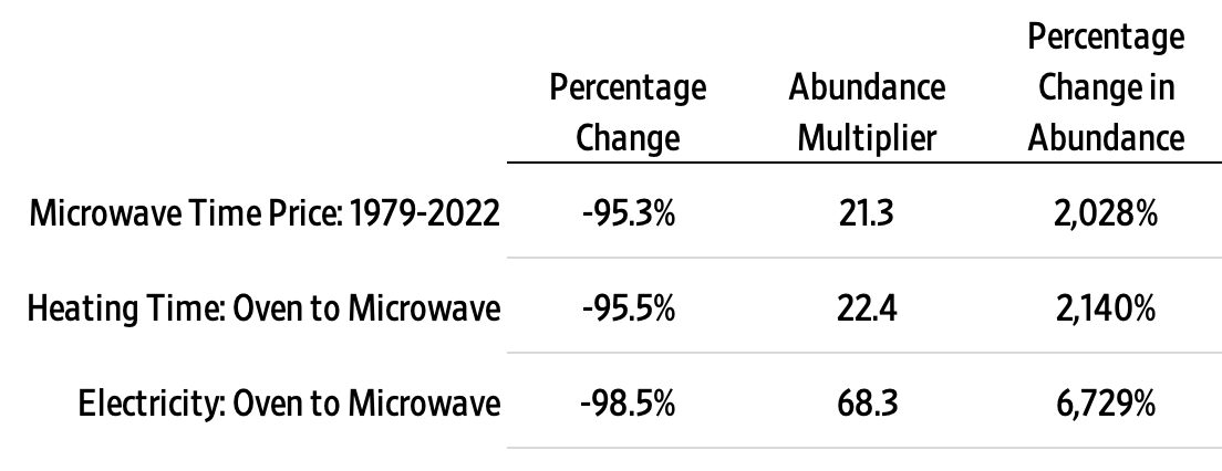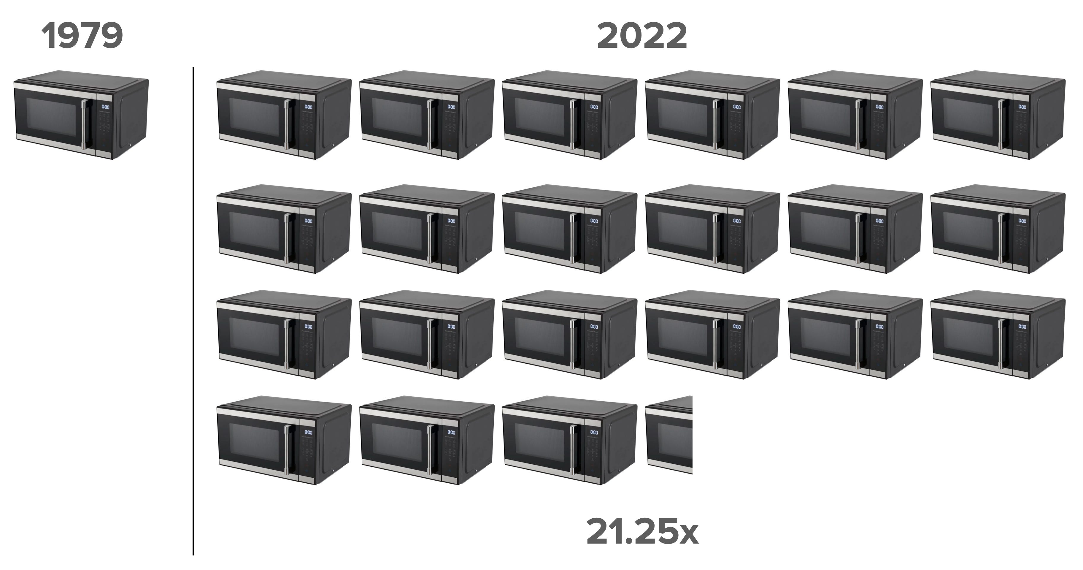In 1979 microwaves were selling at Sears for $399.85. Unskilled workers back then were earning around $3.69 per hour making the time price 108.4 hours. Today unskilled workers are earning around $14.50 an hour, and a basic microwave at Walmart is only $74. That would put the time price around 5.1 hours. The time price fell by 95.3 percent. Microwave innovation has given us 103.4 extra hours today relative to 1979. For the time it took grandpa to earn the money to buy his microwave 43 years ago, you get over 21 today. Microwave abundance has been growing at a 7.37 percent compound annual rate.