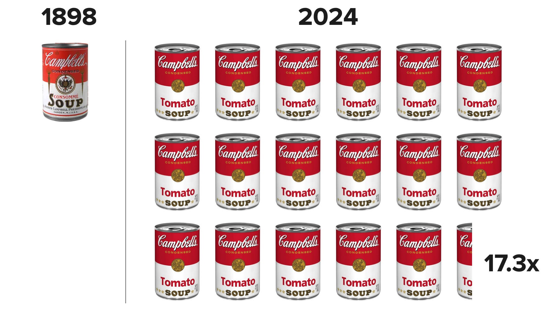 Soup abundance has increased by 1,630 percent. If there had been no innovation in the soup industry a can would cost $21.46 today. Also note that world population increased by 412 percent from 1.6 billion in 1898 to 8.2 billion today. Every one percent increase in population corresponded to a 3.96 percent increase in tomato soup abundance.