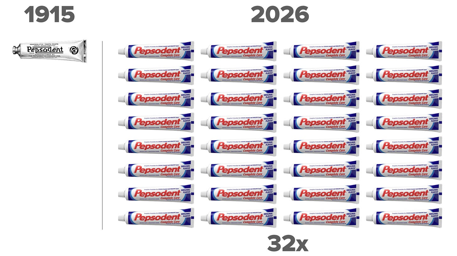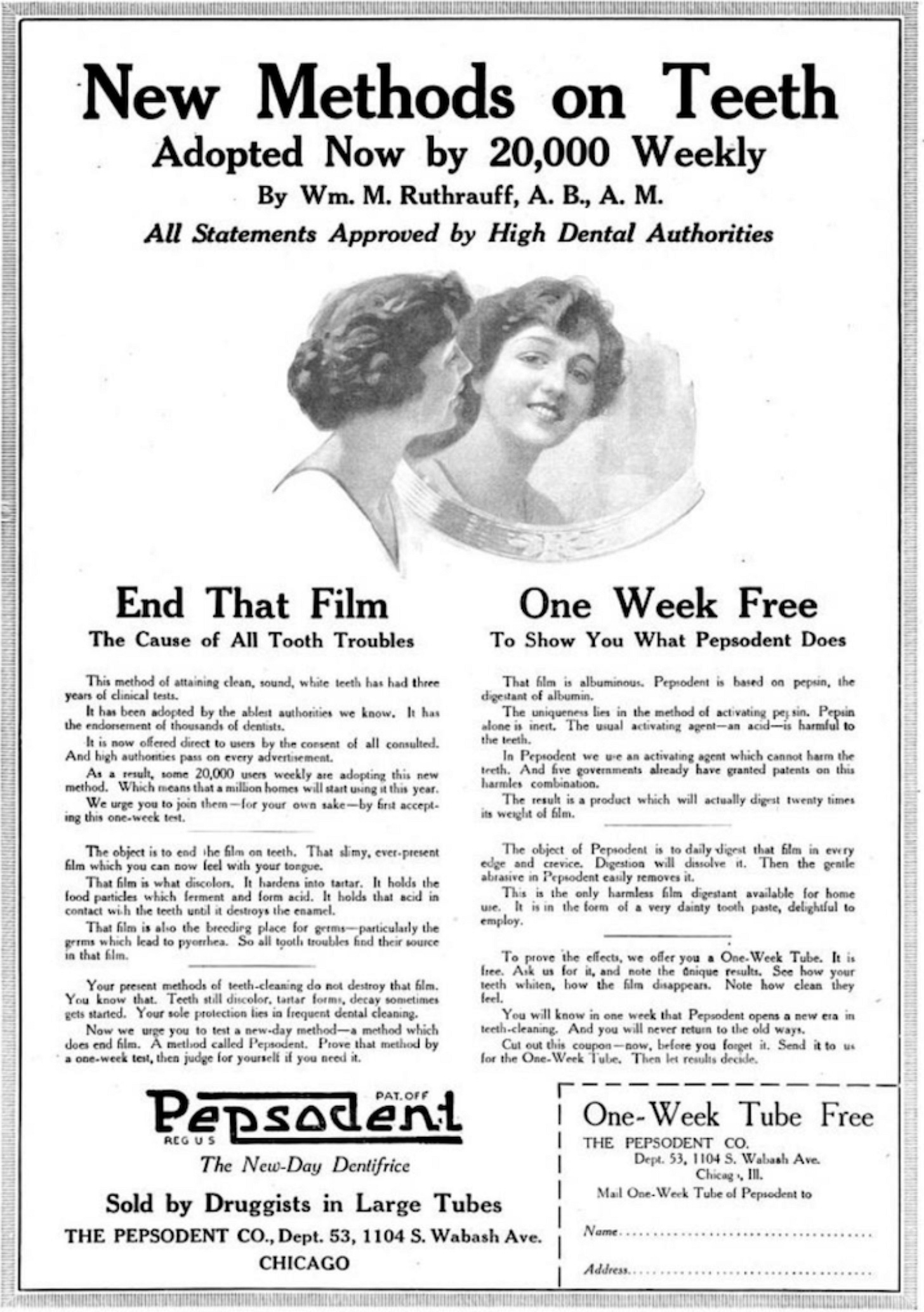 The original Pepsodent formula was patented in 1915 by William M. Ruthrauff. At the time only 7 percent of Americans used toothpaste. A decade after Pepsodent’s nationwide ad campaign, that number had jumped to 65 percent.