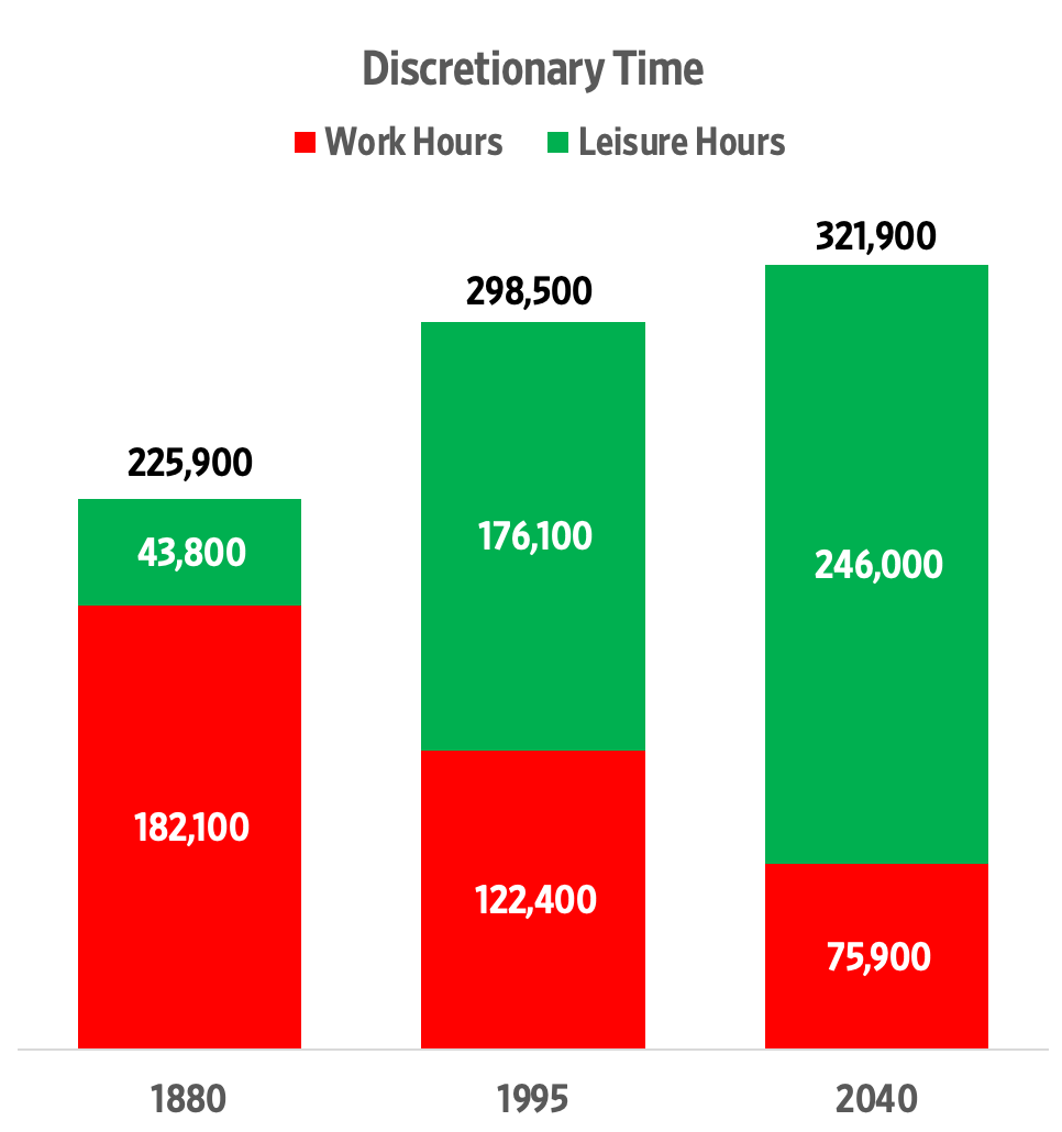 Nobel laureate economist Robert Fogel noted in his 2000 book The Fourth Great Awakening and the Future of Egalitarianism that work hours were falling and leisure hours were increasing. Fogel used the term “discretionary hours” to refer to time beyond sleep, meals, and hygiene. These discretionary hours are available for work, leisure, and other activities. Work hours included paid work, travel time to and from work, and household chores. Fogel's research focused on how the balance between work and leisure has shifted over time, particularly in the 20th century, due to factors like technological advancements and increased productivity. He projected that by 2040, lifetime leisure hours would be triple the number of lifetime working hours. In 1880 leisure hours represented 19 percent of discretionary time. In 1995 they had increased to 59 percent. By 2040 they are expected to be 76 percent. Nice.